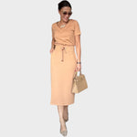 El conjunto Aria combina elegancia y comodidad en un look moderno y versátil. Compuesto por un top con escote en pico y una falda midi de talle alto, este conjunto se adapta perfectamente a una gran variedad de ocasiones, desde eventos informales hasta salidas más sofisticadas. El detalle del cordón de ojal en la cintura garantiza un ajuste elegante y femenino, mientras que el tejido de tacto suave proporciona una comodidad total.