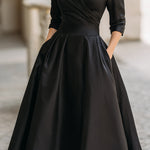 Sumérgete en un mundo de sofisticación con Amália: la combinación perfecta de encanto vintage y elegancia moderna. El vestido cuenta con un escote drapeado, un cuerpo ajustado y una falda fluida de corte en A que resalta maravillosamente tu silueta. Los bolsillos ocultos en las costuras laterales hacen que el vestido sea tanto hermoso como funcional.