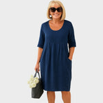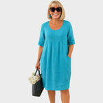 Este elegante vestido de lino es perfecto para el día a día. Con escote redondo, silueta relajada y prácticos bolsillos laterales, es perfecto para los días cálidos, los paseos por el jardín o las salidas informales. Sencillo, transpirable y favorecedor para todas las edades.