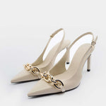 Los Valéria son el equilibrio ideal entre sofisticación y actitud. Con punta fina y tacón medio, este modelo slingback en tono neutro se realza con una cadena metálica frontal que le añade un toque moderno y refinado. Un clásico reinventado para mujeres que no renuncian al estilo y la comodidad.