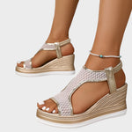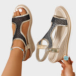 Esta sandalia combina elegancia y comodidad con un diseño moderno que combina tiras doradas y malla negra para un look sofisticado y transpirable. La plataforma añade altura sin sacrificar la comodidad, mientras que el tacón elástico garantiza un ajuste práctico y seguro. Detalles delicados, como las costuras y el acabado brillante, realzan el encanto de la pieza.