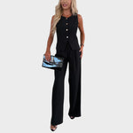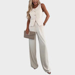 Con el Conjunto Lucile Tailored, lucirás un look elegante que siempre te favorece. Ya sea para comer, explorar la ciudad o cenar en una terraza por la noche, este conjunto garantiza un look elegante y sin esfuerzo. El chaleco sin mangas con cierre de botones clásico irradia sencillez y elegancia, mientras que los pantalones anchos de corte fluido crean una silueta moderna y femenina. Combinados o por separado, este versátil dúo es perfecto para cualquier ocasión.
