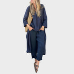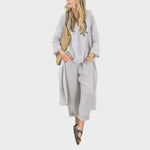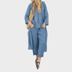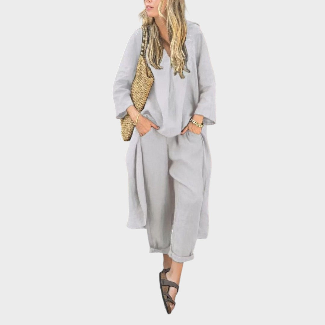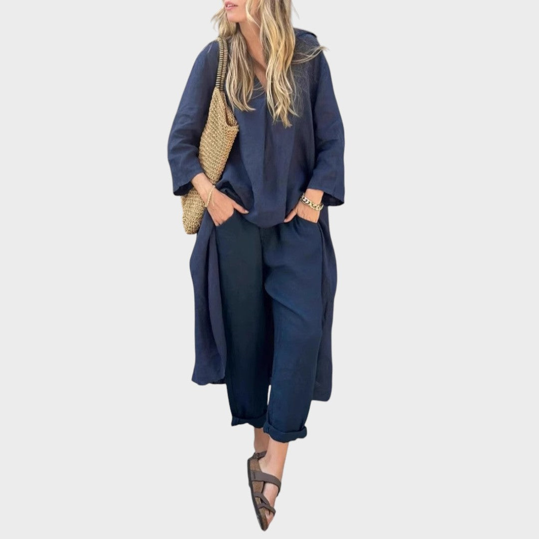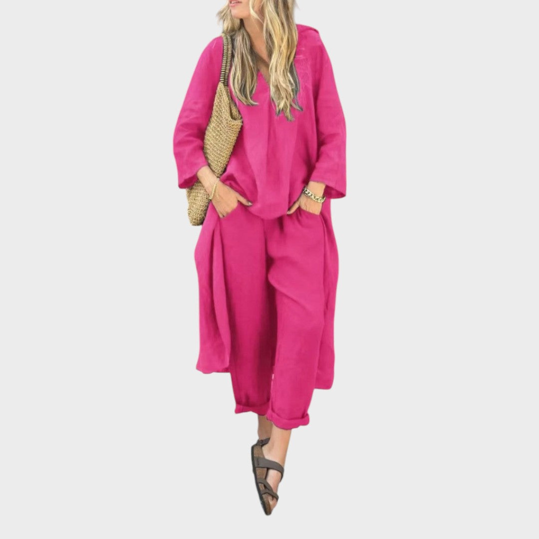 Ya sea para mañanas frescas o paseos en la hora dorada, este vibrante conjunto está hecho para seguir el ritmo. El top holgado de cuello en V y los pantalones anchos combinan la transpirabilidad del algodón y el cáñamo con la fluidez, ofreciendo estilo y comodidad durante todo el día en una silueta llamativa.