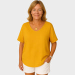 Grace es ese jersey básico que marca la diferencia en tu armario. Con un corte holgado y cómodo, cuello redondo y mangas cortas, es el jersey ideal para los días relajados sin renunciar al estilo. Confeccionado en un tejido suave y transpirable, se adapta al cuerpo con ligereza y suavidad.