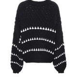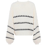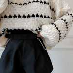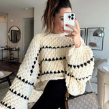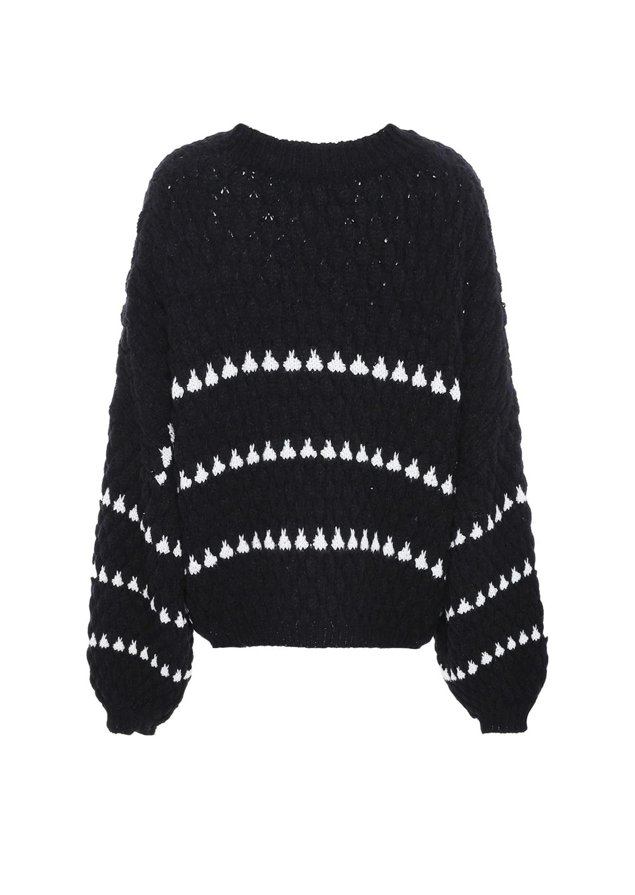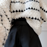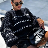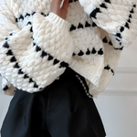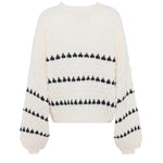 Acomódate con Serena. Esta suave mezcla de tejidos te hará sentir muy cómoda.  Presenta un patrón triangular negro en contraste en el cuerpo y las mangas que crea una estética minimalista y elegante. Con un corte oversize y mangas globo, es perfecta para combinar con cualquier look y elevar instantáneamente el nivel del conjunto.