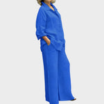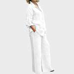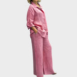 Lara es un conjunto transpirable de dos piezas diseñado para mujeres que valoran la elegancia relajada con comodidad y estructura. Con una blusa de manga larga abotonada con cuello de solapa y pantalones anchos a juego, este look es perfecto tanto para salidas urbanas relajadas como para un look sofisticado de resort. Confeccionado en una mezcla de algodón y poliéster, ofrece una sensación ligera con un acabado refinado, ideal para los cálidos días de verano o las noches más frescas.