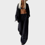 Descubre el conjunto Luna en algodón de primera calidad: una camisa oversize a rayas, un versátil cropped top y unos pantalones de cintura alta y pierna ancha. Cada pieza tiene un corte ligero y un tacto suave, combinando comodidad y elegancia en un look urbano que combina con tu estilo. Perfecta para pasar del día a la noche con autenticidad y frescura.