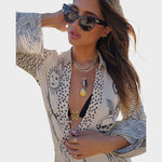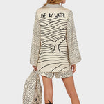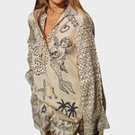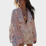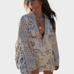 Su corte fluido y su tejido ligero lo hacen ideal para los días soleados junto al mar, ya que puede utilizarse tanto como prenda de playa como prenda informal elegante. El escote profundo con detalles estampados de estrellas añade un toque sensual y desenfadado, mientras que las mangas amplias con puños ilustrados garantizan un look llamativo.